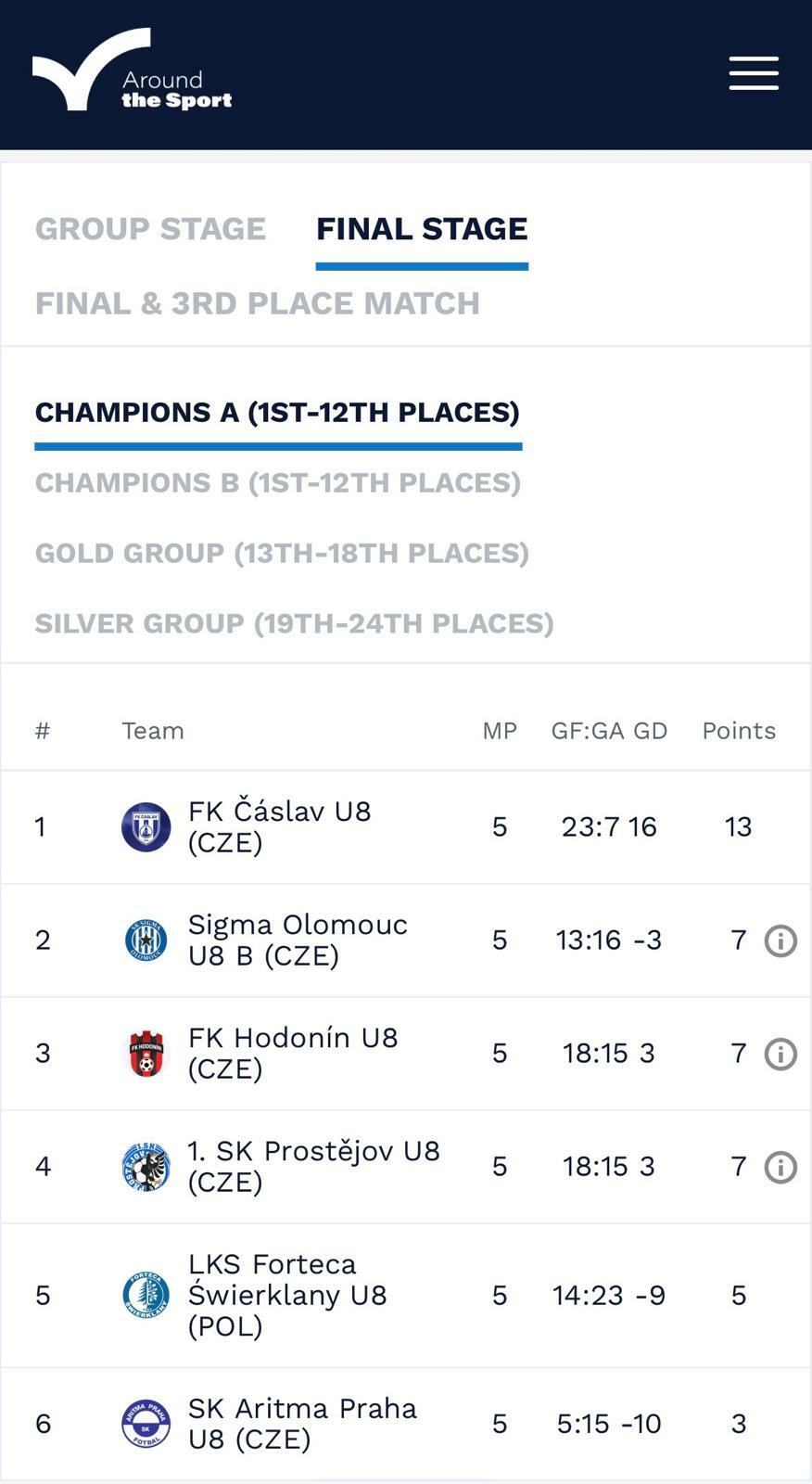 V sobotu se týmu podařilo obstát v silné konkurenci české i moravské špičky ligových klubů a velkých zahraničních akademií. Díky bojovným výkonům si kluci vybojovali skvělé 3. místo ve skupině, které znamenalo postup do elitní nedělní skupiny Champions A.